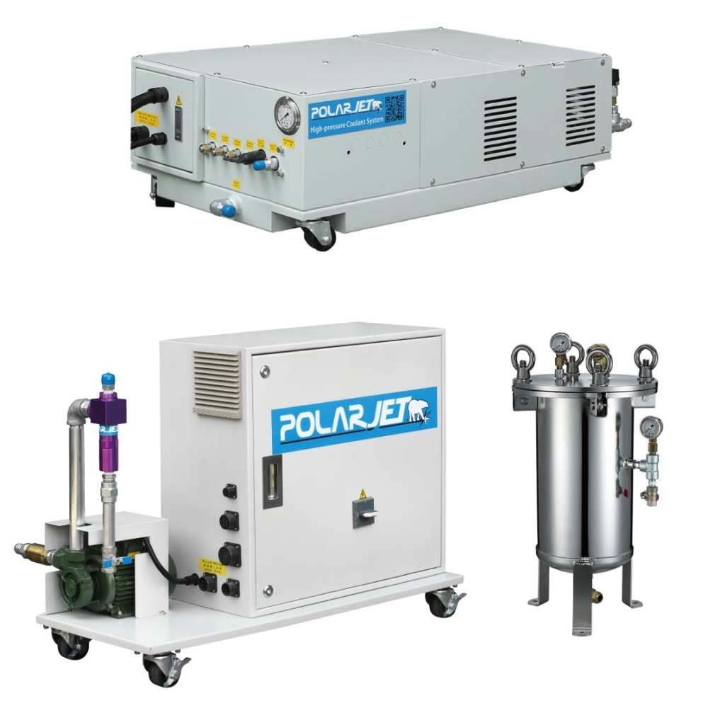 PolarJet針對走心式車床研發出適合安裝於送料機下的高壓切削冷卻液系統,有效的提高生產效率,如深孔加工,槍鑽等。