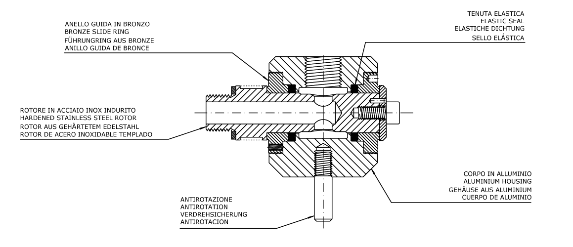 The ROTOFLUX unions model M, thanks to the special design of the seals and the ground, hardened and lapped, surface of the rotor, may operate with low friction and wear, at low rotation speed with high fluid pressure, even for long time.
